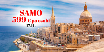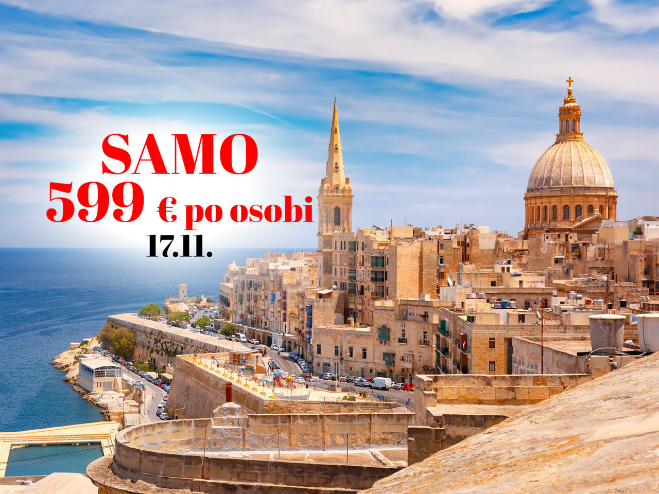Susret s pratiteljem putovanja u zračnoj luci Zagreb ispred šaltera informacija u 04:00 h. Prijava za direktan let za Maltu u 05:50 h s dolaskom u 07:45 h. Po slijetanju na Maltu krećemo turističkim autobusom u razgled Valette u pratnji lokalnog vodiča i našeg pratitelja (fakultativno). Grad je izgrađen nakon velike opsade 1565.g. i nazvan prema velikom Meštru Jeanu Parisotu de la Vallette koji je zaslužan za obranu Malte od flote Sulejmana veličanstvenog. Razgled započinjemo u vrtovima Barrakka izgrađenim na povišenim bedemima, a s kojih se pruža fantastičan panoramski pogled na Grand Harbour i tri grada. Nastavljamo sa obilaskom te ćete izvana moći vidjeti katedralu Sv.Ivana koja se ne smije propustiti zbog svoje barokne arhitekture. Nakon Katedrale posjetit ćemo Palaču Velikog Meštra - ova palača bila je službena i privatna rezidencija Velikog učitelja Reda. Danas je palača rezidencija predsjednika Malte. U Palači se nalaze dvije sobe koje se mogu posjetiti; Soba za naoružanje i Državne sobe (napomena - državne sobe je moguće posjetiti samo ako se ne odvijaju nikakvi drugi angažmani vlade).