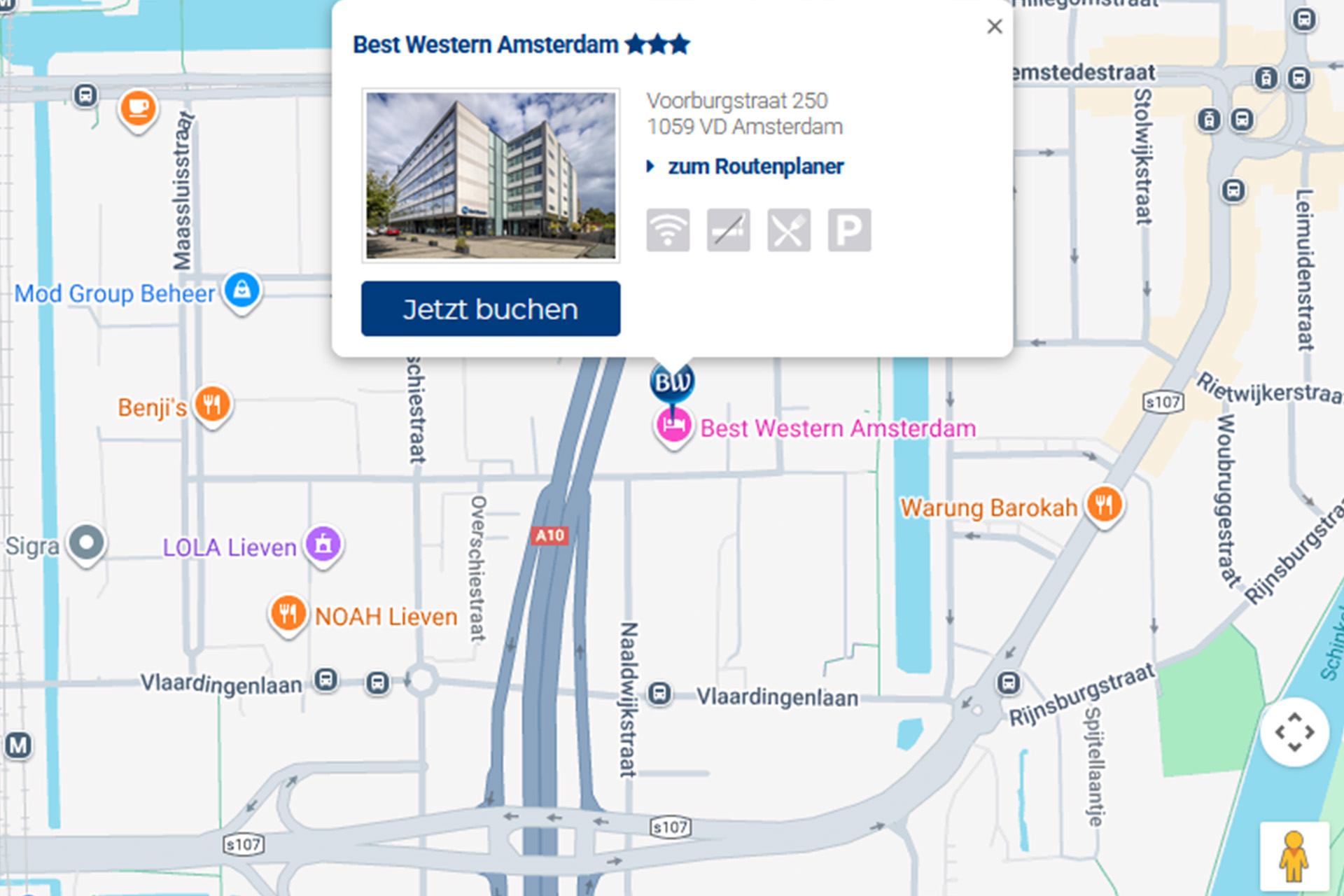 Hotel Best Western Amsterdam smješten je u zapadnom dijelu Amsterdama, u kvartu Amsterdam-West, na adresi Voorburgstraat 250, 1059 VD.