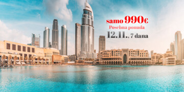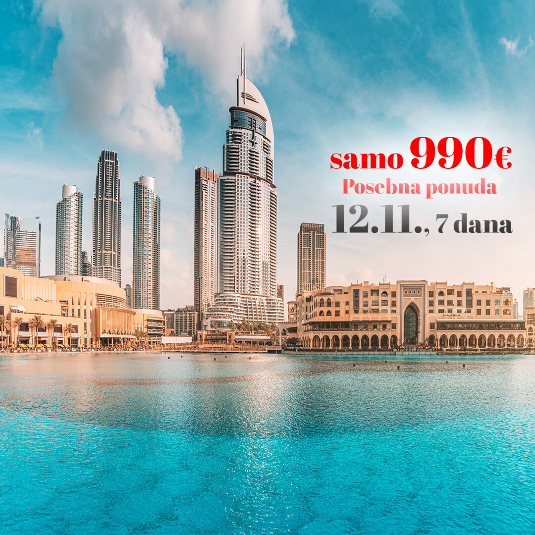 Nakon doručka odlazak na poludnevni razgled grada starog i modernog Dubaija. Panoramska vožnja najstarijim dijelovima Dubaija: Deira i Bur Dubai. Vožnja pored Bastakiye – stare četvrti autohtone arhitekture. Vožnja na drugu stranu zaljeva tradicionalnim brodićem abra do poznate tržnice začina, tekstila i zlata: spice souk i gold souk. Zaustaviti ćemo se kod Muzeja budućnosti jedna od najljepših zgrada na svijetu. Eliptična metalna zgrada privlači pažnju svojim oblikom i visinom od 77 metara. Nastavak vožnje do najluksuznijeg dijela Dubaia – Jumeirah. Odlazak na Souk Madinat Jumeirah – jedan od najljepših kompleksa hotela, trgovina, suvenirnica, restorana, ispresijecanih kanalima – mala Venecija Dubaija uz pogled na magičan hotel Burj Al Arab, jedan od najluksuznijih hotela na svijetu, u obliku jedra. Slobodno vrijeme za kavu. Slijedi odlazak do čuvene Dubai Palme – umjetno stvorenog otoka u obliku palme na kojem se nalaze luksuzni hoteli, stanovi, kuće i vile poznatih svjetskih zvijezda. Po silasku s palme odlazak do predivne Dubai Marine uz kraće zaustavljanje za slikanje. Nastavak vožnje cestom Sheikh Zayed, novim središtem grada pored najvišeg tornja na svijetu Burj Khalife, visine 828 m i sa 160 katova. Odmah do Burj Khalife nalazi se Dubai mall, najveći trgovački centar na svijetu, a uz njega i čuvene fontane u čijem showu možete uživati svakih pola sata u terminu od 18-23 sata. Slobodno vrijeme za shopping i šetnju do čuvenog spomenika The Wings of Mexico. Za kraj dana predlažemo večeru u nekom od lokalnih restorana s pogledom na fontane.