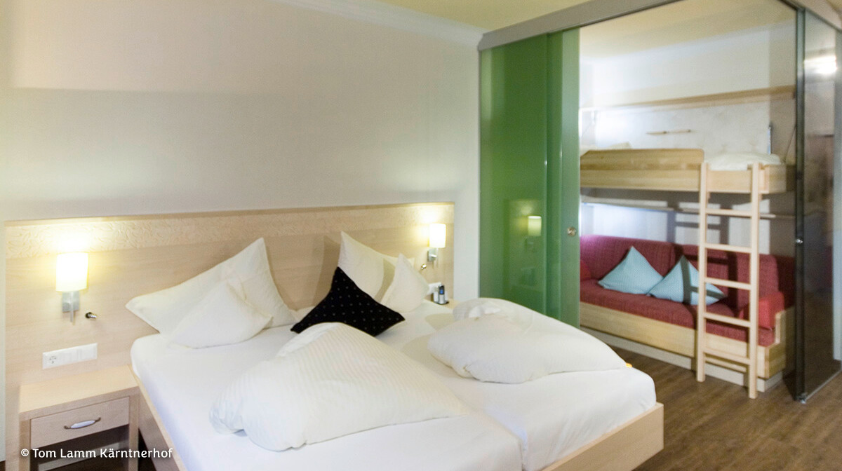 1/2+2 obiteljska soba Kärnten: cca 45 m2, bračni ležaj i krevet na kat za djecu ograđen pomičnom stijenom, kabelska TV, radio, balkon, mini bar, sef, WLAN
