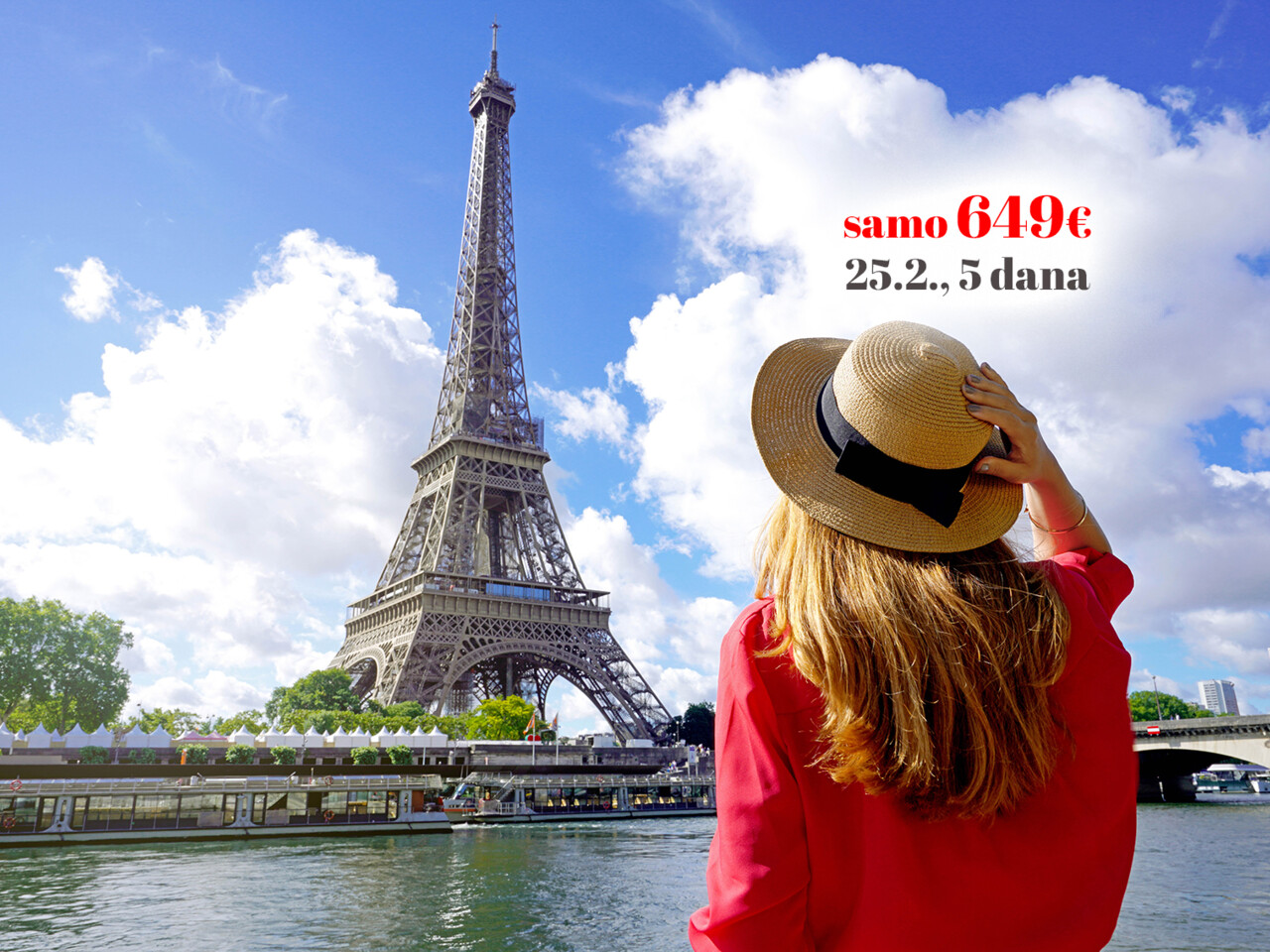 Sastanak putnika u Zračnoj luci Franjo Tuđman Zagreb kod šaltera informacija na 2. katu 2 sata prije leta te prijava na direktan let za Pariz u 08:25/09:00 h (ovisno o datumu putovanja, svi redovi letenja navedeni su u tablici ispod programa). Po slijetanju u Pariz odlazak na panoramski razgled grada autobusom: Latinska četvrt, Pantheon, poznato sveučilište Sorbonne, Luksemburški vrtovi, Musee d'Orsay, Musee Rodin, Dom des Invalides gdje je smještena grobnica Napoleona Bonapartea, Eiffelov toranj, prelazimo Seinu i dolazimo do Trocadera te najpoznatije Avenije Champs-Elysees s poznatim Arc de Triomphe – slavolukom pobjede. Nastavljamo do Opere, Place Vendome s poznatim hotelom Ritz i nizom najskupljih draguljarnica, Place de la Concorde, najpoznatiji svjetski muzej Le Louvre, gradska vijećnica – Hotel de Ville, Place de la Bastille... Smještaj u hotel. Nakon kratkog odmora nastavljamo s razgledom grada. Posjet Montmartreu s kojeg se pruža prekrasna panorama na grad. Potpuno bijela crkva Srca Isusovog (Sacre Coeur), do koje se dolazi strmim stepenicama, druga je najviša točka u gradu. Tu je i crkva St. Pierre te Trg Tertre gdje slikari svoja djela prodaju izravno sa štafelaja, brojne trgovine i suvenirnice. Slobodno vrijeme. Navečer predlažemo zajednički odlazak na večeru u tipičan pariški restaurant na Montmartru. Povratak u hotel. Noćenje.