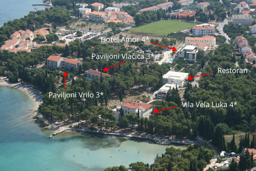 SOBE: raspoređene u četiri zgrade, standard sobe se nalaze u paviljonima Vrilo i Vlačica, superior sobe u hotelu Amor ili u Vili Vela Luka ( deluxe sobe, ispod restorana).