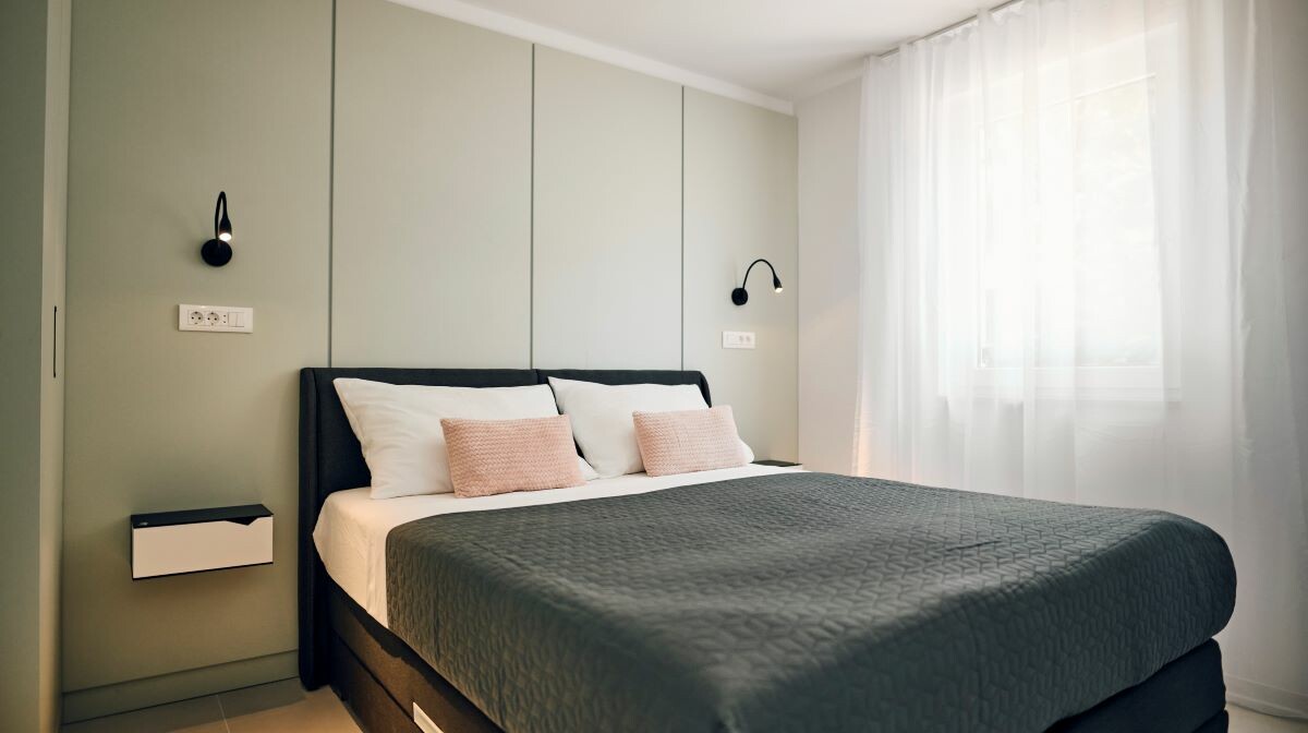 Spavaća soba s bračnim krevetom (160x200 cm) nalazi se na ulazu u apartman.
