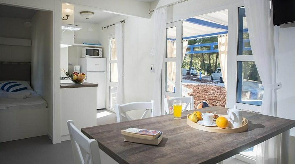 Naše kućice u svojih 35 ili 32 metara kvadratnih mogu primiti do 6 osoba. Središnja prostorija je dnevna soba s kompletno namještenom i opremljenom kuhinjom. Dvije spavaće sobe su jednostavno, ali ugodno namještene te svaka ima svoju vlastitu kupaonicu s tuš kabinom, umivaonikom i zahodom. Sve mobilne kućice opremljene su klima uređajem. Svaka kućica ima besplatan WiFi.