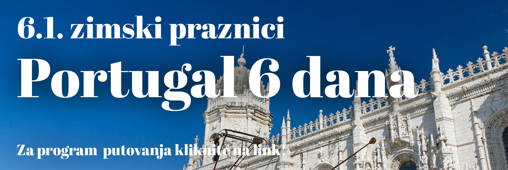 Sastanak putnika u Zračnoj luci Franjo Tuđman Zagreb 2 sata prije leta na odlaznom terminalu gdje će vam pratitelj putovanja podijeliti putnu dokumentaciju. Let za Lisabon sa međuslijetanjem, prema redu letanja navedenom ispod programa. Po slijetanju u Lisabon, nakon obavljanja carinskih formalnosti, slijedi transfer autobusom do grada te odlazak do jedne od najpoznatijih lisabonskih četvrti – Belem koja je pod zaštitom UNESCO-a. Prvo ćemo otići do jednog od simbola grada, prekrasne Belemske kule koja izgleda kao da je izgrađena od pijeska, a nekada je služila za obranu grada. Od tuda se pruža i pogled na moderan Most 25. travnja, koji podsjeća na Golden Gate most u San Franciscu. Nakon toga idemo do Spomenika Otkrićima te obližnje crkve i samostana sv. Jeronima odakle su kretali brodovi na istraživačke pohode i mjesto gdje je sahranjen Vasco da Gama. Slobodno vrijeme za šetnju do najpoznatije lis bonske slastičarnice Pastusi de Belem iz 1837. godine gdje svakako savjetujemo kušanje istoimene slastice. Odlazak do hotela. Smještaj u hotel te navečer odlazak do centra grada u pratnji pratitelja putovanja. Šetanja i slobodno vrijeme za večeru. Povratak u hotel. Noćenje.