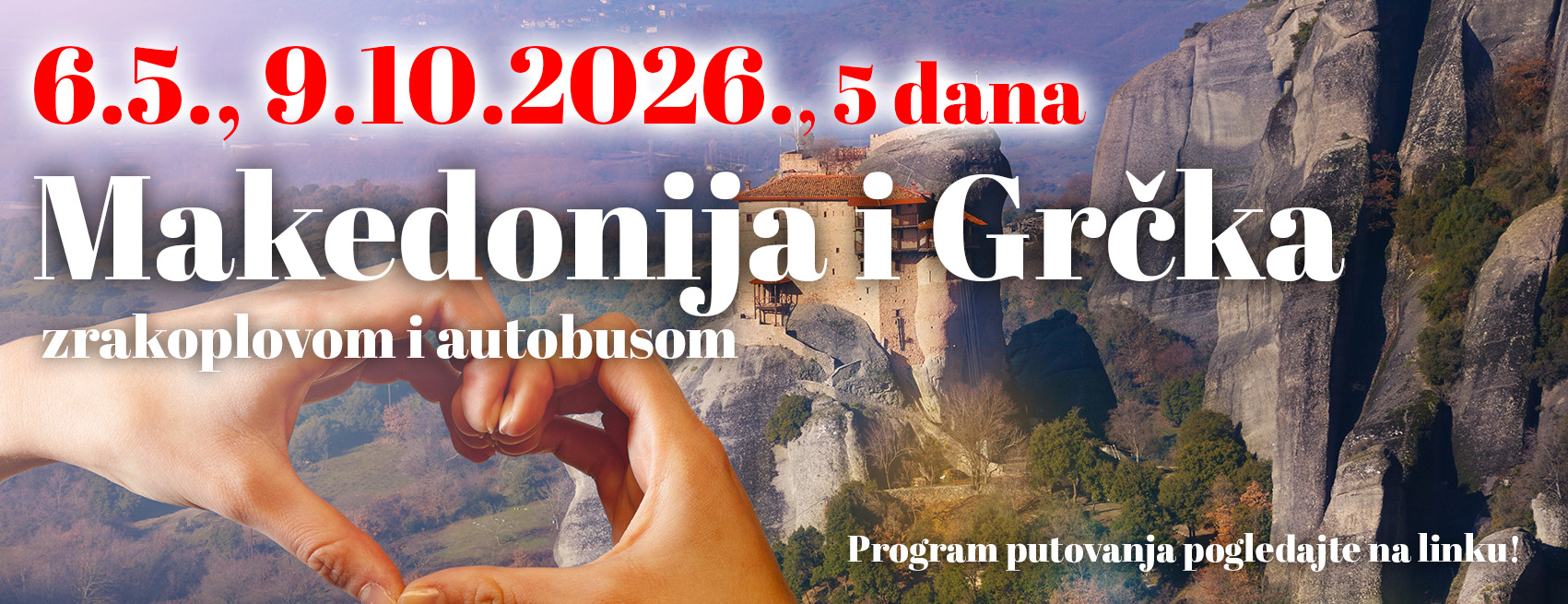 Nakon doručka, susret s lokalnim vodičem i odlazak na razgled grada. Skoplje je prijestolnica i najveći grad Republike Makedonije smješten u dolini rijeke Vardar, a ujedno je i njeno glavno političko, gospodarsko, obrazovno i kulturno središte. Živopisan je to grad s više od 2000 godina tradicije u kojem se na svakom koraku isprepliće tradicionalno i moderno. Vidjet ćemo staru željezničku stanicu, danas Muzej grada Skopja; spomen-kuću Majke Tereze, otvorenu povodom 100. obljetnice njezina rođenja; Trg Makedonija; kameni most iz 6. st.; Daut Paša Amam, staru tursku kupelj iz 15. st. u kojoj se smjestila Nacionalna galerija; crkvu sv. Spasa; gradsku tvrđavu Kale. Nakon razgleda posjetite Staru skopsku čaršiju, najveću na Balkanu izvan Istanbula, gdje možete doživjeti duh prošlih vremena i pojesti odlične čevape! Oko 13.00h prijevoz prema zračnoj luci Skoplje. Po dolasku, prijava za let Croatia Airlinesa za Zagreb, OU 369 u 15.55h s očekivanim dolaskom u 17.10h. Završetak programa.