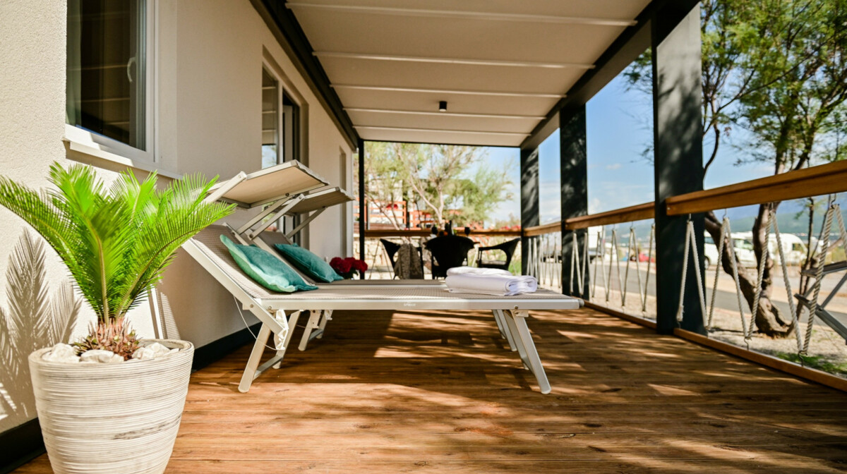 Opremljena klima uređajem, televizijom, prostranom terasom površine 21 m2, sa sjedećom garniturom i ležaljkama. Mobilna kućica uređena je u modernom stilu za najugodniji mogući boravak.