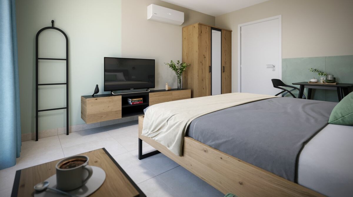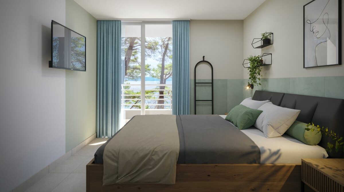 Apartman (min 2 odrasle osobe, maksimalno 2 odrasle osobe + 2 djece): ukupno 40 jedinica, površina jedinice 42,85 m2, opremljena sušilom za kosu, telefonom, satelitskom televizijom, klimom, tuš / WC-om, kombiniranim dnevnim boravkom i spavaćom sobom (fotelja i / ili kauč na razvlačenje), odvojena spavaća soba s krevetom za dvije osobe (twin), kuhinjom sa blagovaonicom te dva balkona prema morskoj strani.