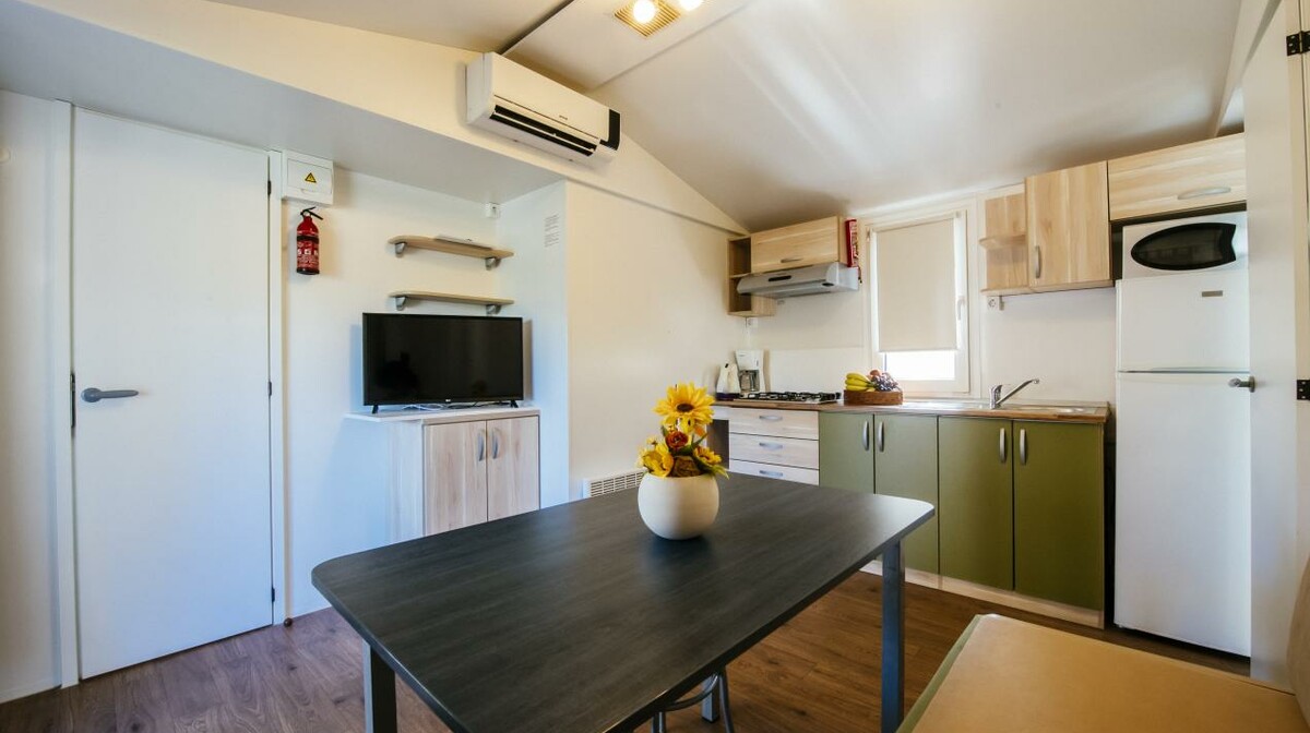 • Mobilne kućice Premium: Broj osoba: 6 + 1, Veličina: 34,4m2, Opremljenost: soba (bračni krevet), soba (2 kreveta za jednu osobu), soba (2 kreveta za jednu osobu), dnevni boravak/blagovaona (ležaj za